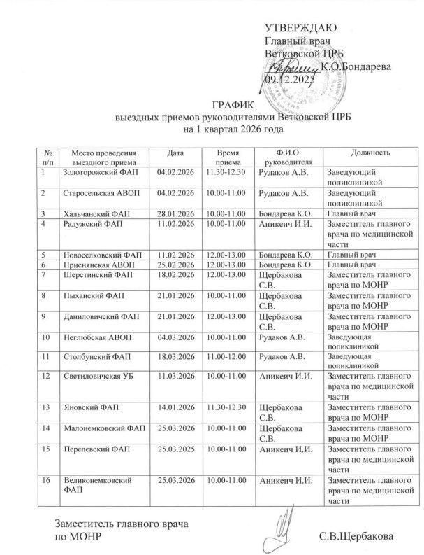 График выездных приемов руководителями Ветковской ЦРБ I квартал 2026 года